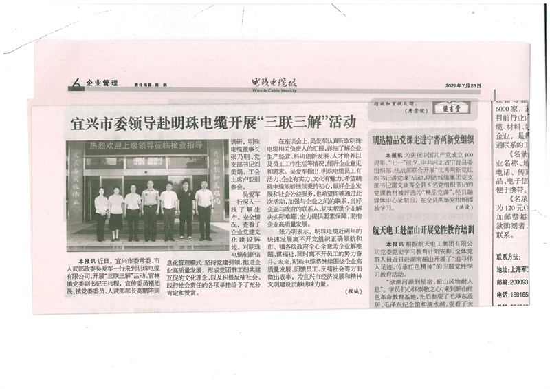 2021.7.23电线电缆报-宜兴市委领导赴明珠开展三联三解活动