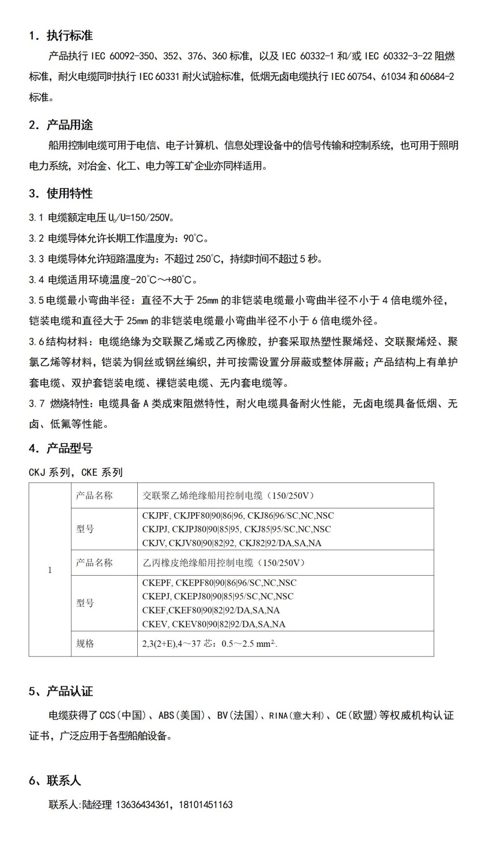 船用通信电缆可用于电信、电子计算机、信息处理设备中的信号传输和控制系统,对冶金、化工、电力等工矿企业亦同样适用。